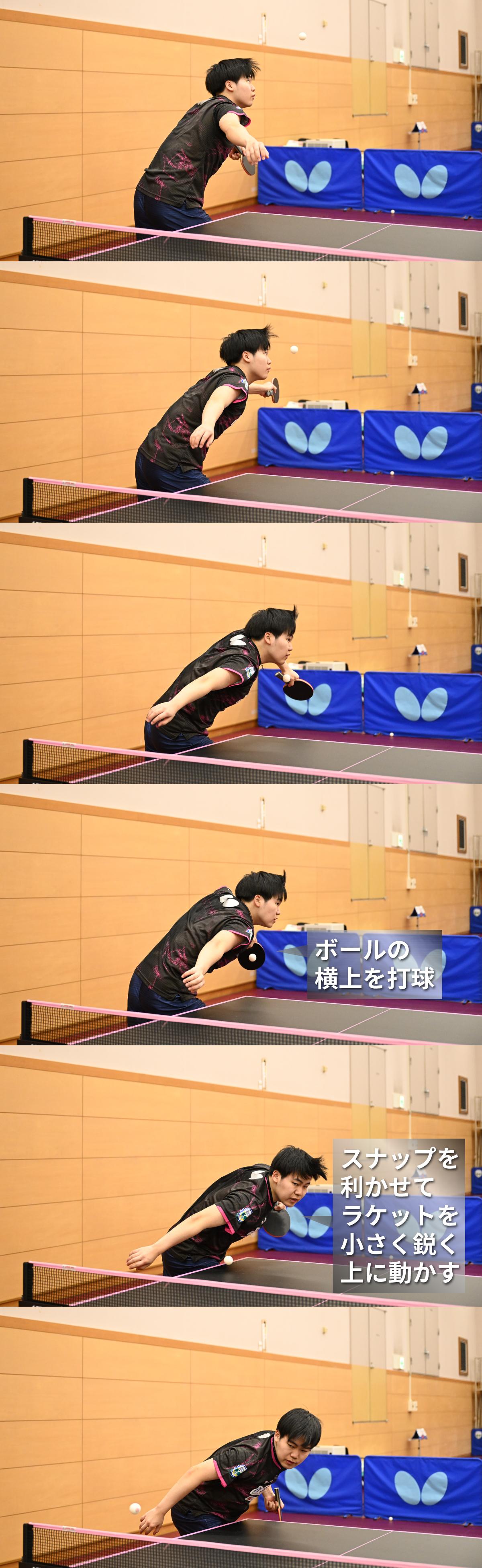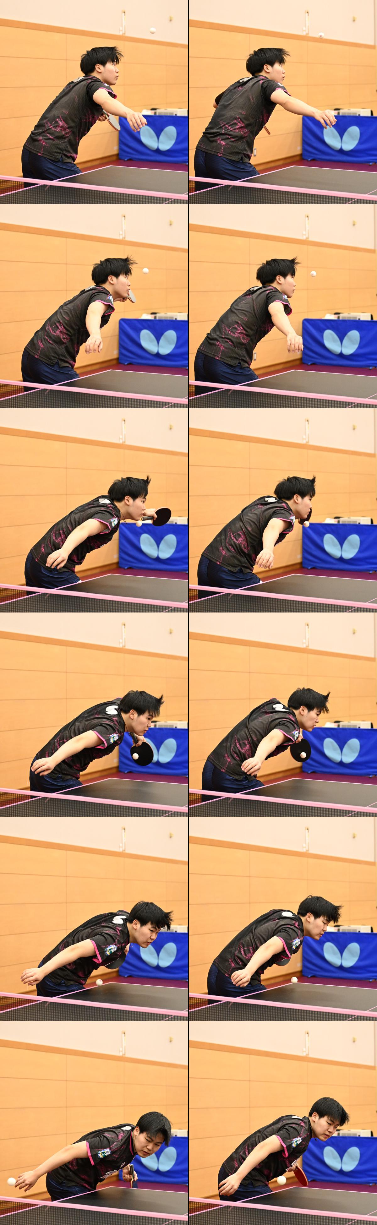 前回紹介してくれた横回転ロングサービスと、今回紹介してくれた横上回転ロングサービス、横下回転ロングサービスを自在に出し分けるのが、松島の強さを支える大きな土台だ。松島のように、1種類だけでなく、ロングサービスのバリエーションを持つことで相手に大きなプレッシャーをかけることができ、戦い方の幅も広がる。松島が話してくれたポイントと連続写真の動作を参考にして、ぜひロングサービスのバリエーションを増やし、その一つ一つを磨いてほしい。