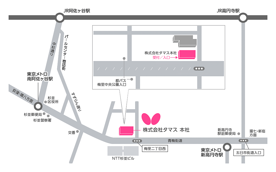 株式会社タマスは、JR阿佐ヶ谷駅から徒歩15分程度のところに位置しています。東京メトロ丸ノ内線の南阿佐ヶ谷駅と新高円寺駅の中間ですのでそちらでもお越しいただけます。