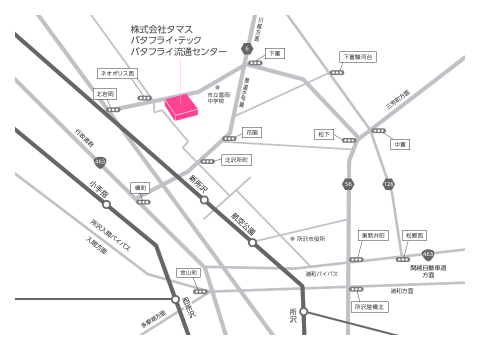 株式会社タマス バタフライ・テックは、西武新宿線新所沢駅より車で5分程度のところに位置しています。