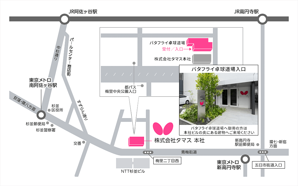 なお、バタフライ卓球道場にご用の際には、一旦本社での受付をお願い申し上げます。