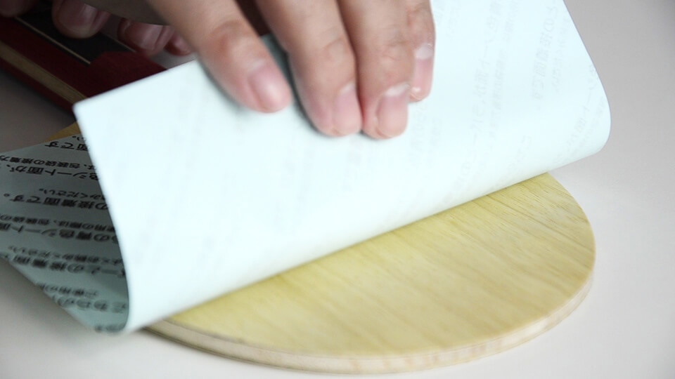 白色のシートを下部分だけはがし、グリップ側からラケットに貼りつけます。次に、白色のシートの残りをはがし、ラケットに貼りつけます。空気が入らないようにゆっくりと貼ってください。