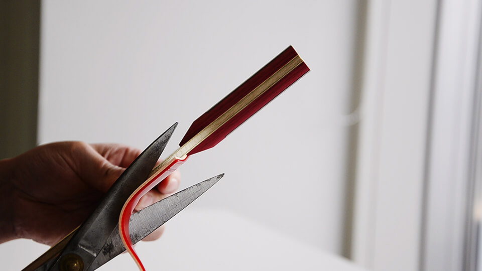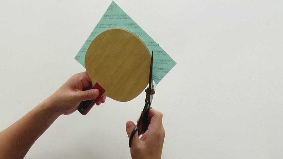 ラバーとラケットを十分に貼り合わせたら、はさみでラケットからはみ出たラバーを切って完成です。