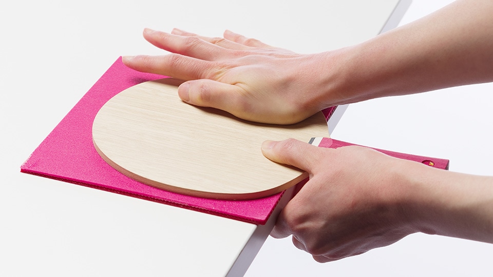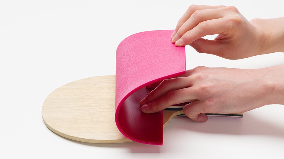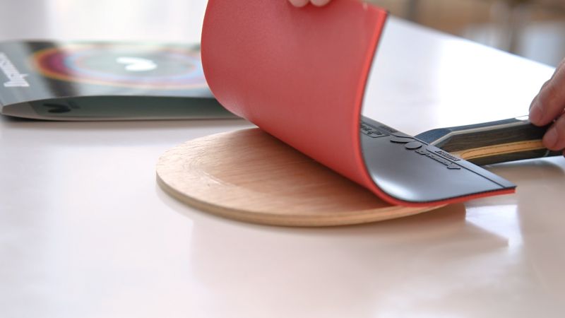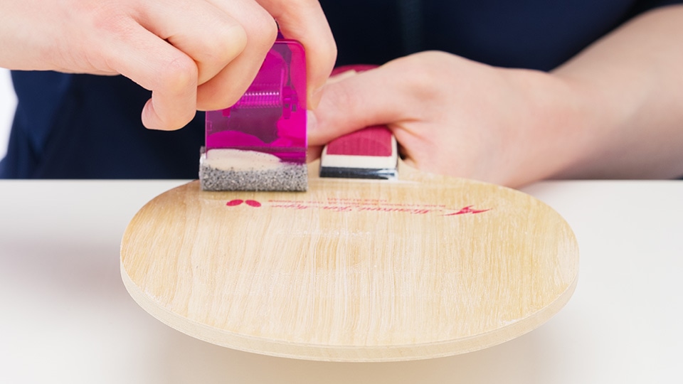 十分に乾いたら、グリップ側からラバーを貼っていきます。空気が入らないように注意して、ゆっくりと貼ってください。ラバー表面を紙で覆い、その面を下にした状態でラケットの裏面を上から両手で抑えてラバーとラケットを貼り合わせます。圧着の際はグリップに負荷がかからないように注意してください。