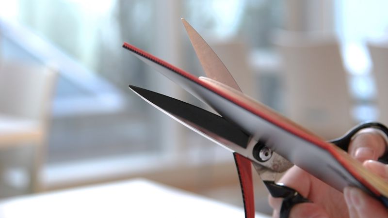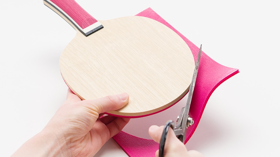 ラバーとラケットを十分に貼り合わせたら、はさみでラケットからはみ出たラバーを切って完成です。