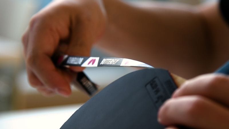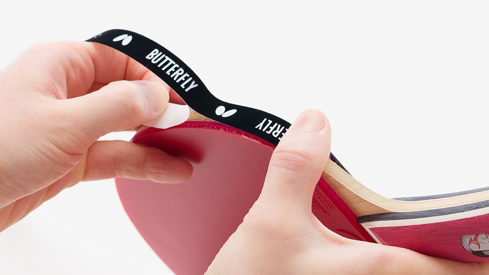 仕上げに、サイドテープをラケットの側面に貼ると、ラケットを保護しつつ、ラバーがラケットからはがれにくくなります。