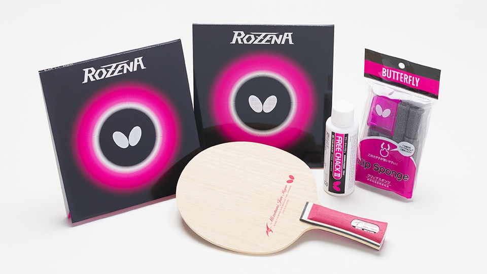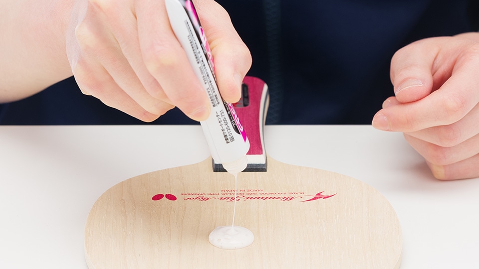 初めに、『フリー・チャック2』をラバーにつけます。量の目安は10円玉くらいで、たくさんつけすぎないようにしてください(ラケット表面に前の接着剤の残りがある場合は、あらかじめ完全に取り除いてください)。