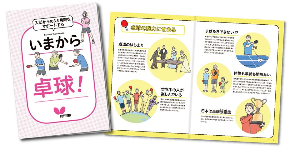 卓球をはじめる中学生や、卓球経験のない顧問の先生のお悩みを解決するために作成した冊子です。部活動への入部準備の始まる4月頃から約3ヶ月間をターゲットとした内容です。楽しく、そして分かりやすく、卓球をはじめていただくお手伝いができますと幸いです。