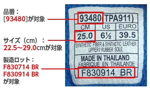 シュータン(ベロ)の裏側にある「サイズネーム」の記載を確認してください。 確認事項1) 1行目、左側の品番表示が「93480」 確認事項2) 3行目、左列(CM欄の下)のサイズ表示が「22.5」から「29.0」に該当 確認事項3) 6行目、製造ロットナンバーが「F830714 BR」または「F830914 BR」 |