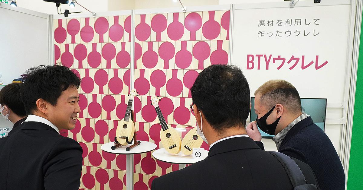 バタフライは三ッ葉楽器株式会社と共同で、卓球ラケットの木材を使用したオリジナルウクレレを制作いたしました。3月12~13日に開催した「バタフライ ブランド フェア 2024スプリング」では、卓球ラケットやアパレルなどの新製品に並び、バタフライオリジナルウクレレが展示され、ご来場の皆さまからは「どんな音なのか興味がわきますね」「ラケットの材料で楽器ができるなんて驚きです」などの声をいただき、会場内でも注目を集めました。ご来場された希望者の方には、後日寄贈を予定しています。「バタフライ オリジナル ウクレレ」の特徴は、ボディの表面と側面に卓球ラケットの上板と同じ材料を使用している点です。ラケットの製造過程において、大きさや外観の基準に満たず廃棄されてしまう材料を利用しています。また、ボディはバタフライロゴの羽と同じ楕円形、サウンドホールは卓球のボールの直径と同じ40mmの円形であり、サウンドホールの奥部分にはオリジナルのステッカーが貼られています。