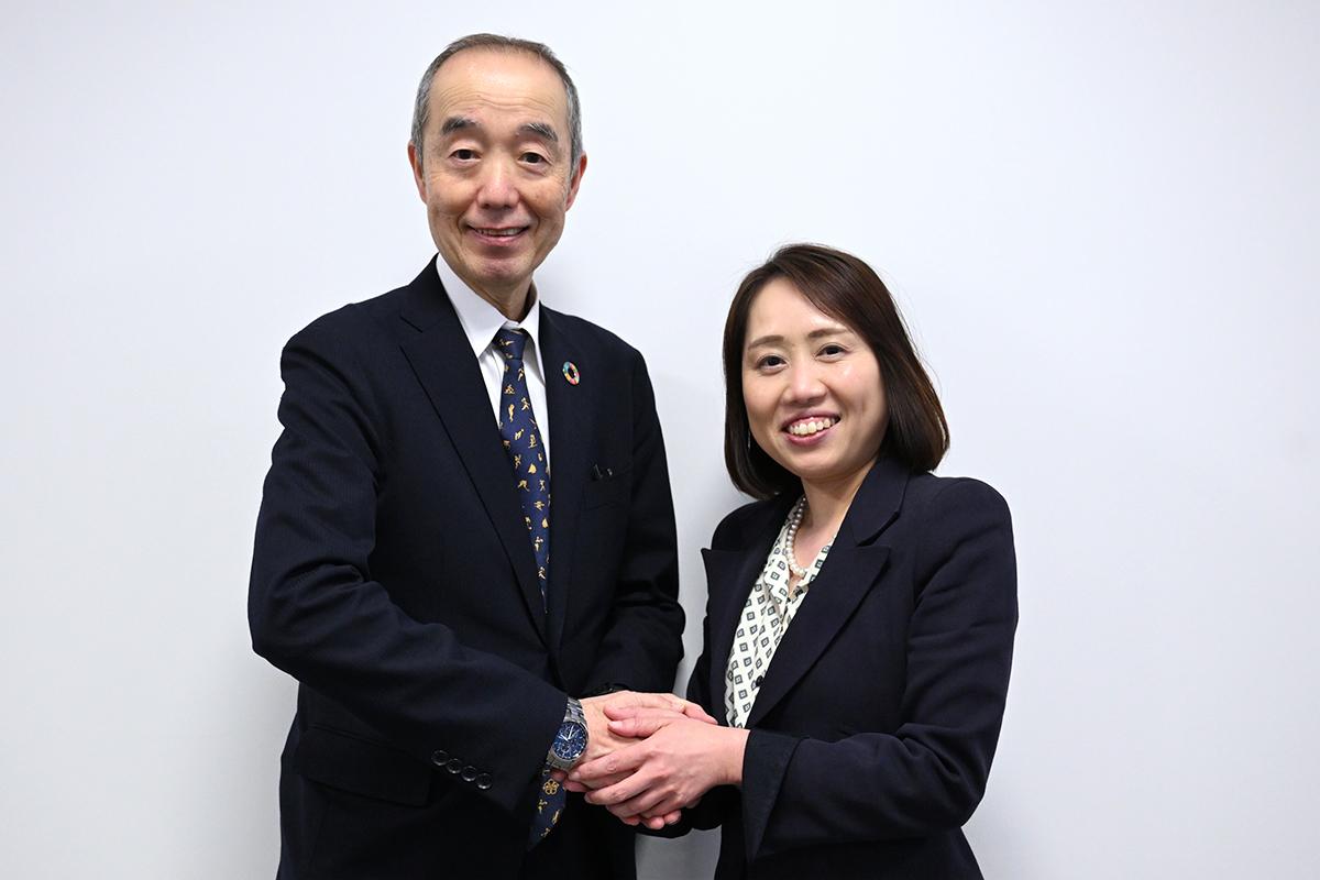 公益財団法人日本卓球協会 副会長 星野一朗氏と握手を交わす当社代表取締役社長 大澤卓子