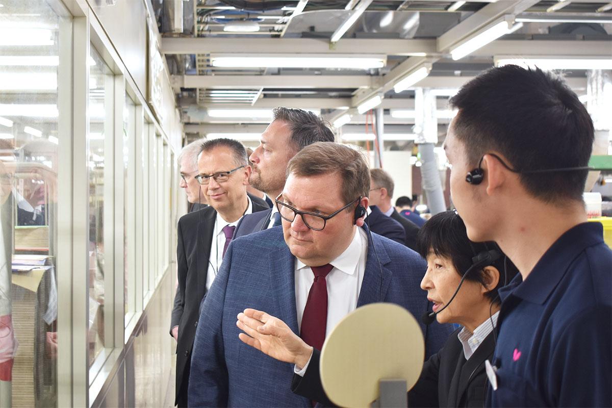 その後、バタフライ・テックを見学され、ラケット工場では材料を選別する工程からラケットが完成するまでの工程をご覧いただきました。フランク・マイヤー市長は、卓球経験者であることもあり、終始、興味深く説明に耳を傾けていました。