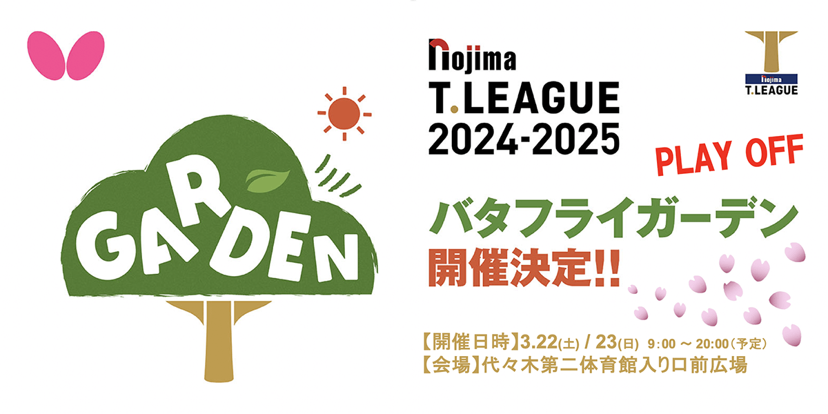 「バタフライ」ブランドを展開する株式会社タマスは、Tリーグと共同し、3月22日(土)、23日(日)に代々木第二体育館で行われる、ノジマTリーグ 2024-2025シーズン プレーオフの会場外にて、人気のキッチンカーが集合するフードコートや、パブリックビューイング、各種ブースが展開される「バタフライガーデン」を開催します。2024-2025シーズン開幕戦でも開催された「バタフライガーデン」。今回はさらにスケールアップ!前回同様、会場内に負けないくらい、会場外でもお楽しみいただけます。試合前や、試合の合間などには、人気の食事メニューや、ミニ卓球台での卓球体験のお楽しみが、また、試合中には大型ビジョンにて試合観戦も可能です。さらに今回は、ステージを設置。アイドルの皆さんやタレントさんをお迎えし、プレーオフを一緒に盛り上げていただきます。