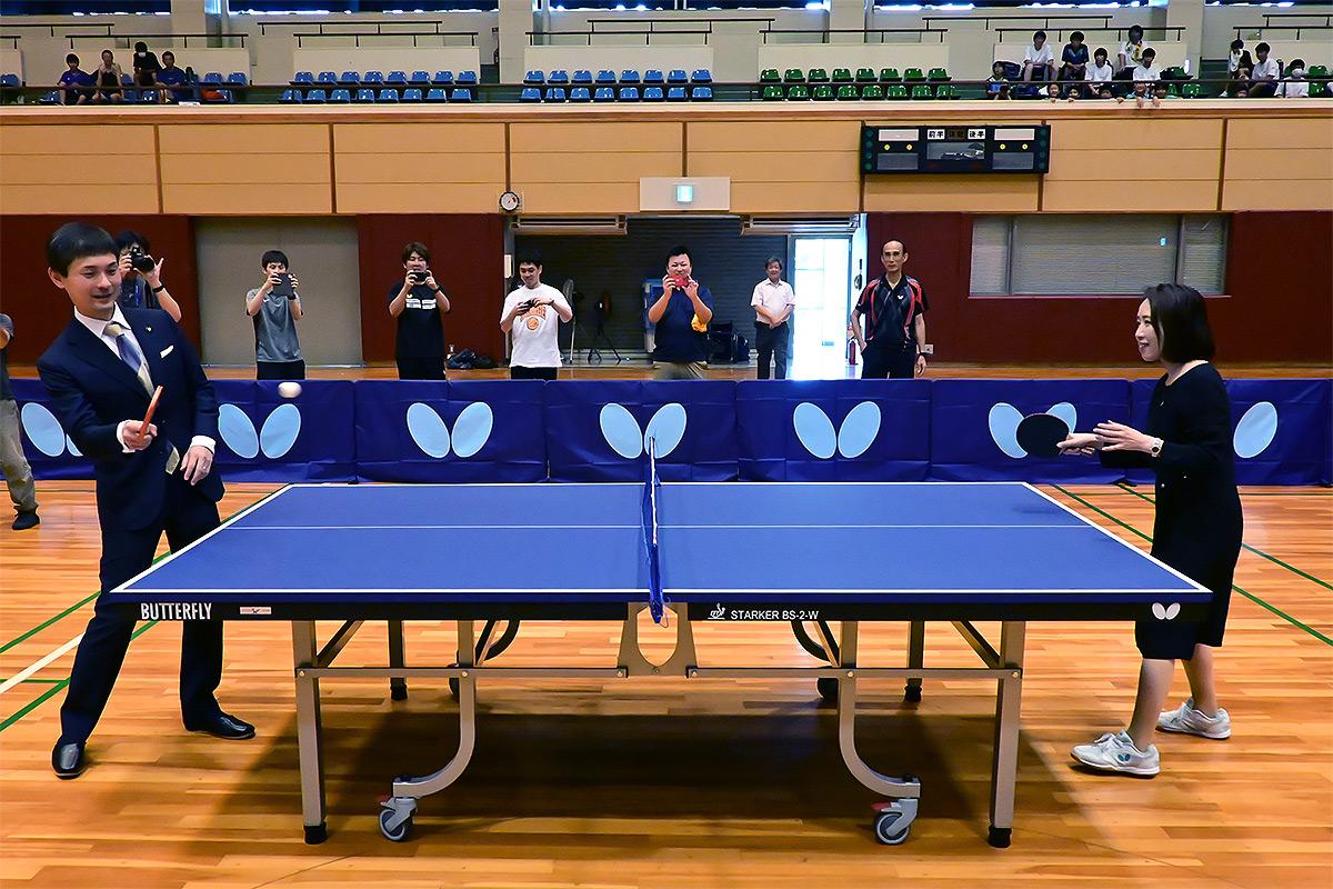 今回の寄贈は、昨年大澤が本体育館に訪問した際、長年使用されている卓球台を目にしたことがきっかけとなりました。7月12日(土)の贈呈式では、出身地への恩返しの思いも込め、大澤から天理市長の並河健氏に目録が手渡されました。さらに並河市長らによる始球式が行われました。