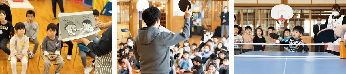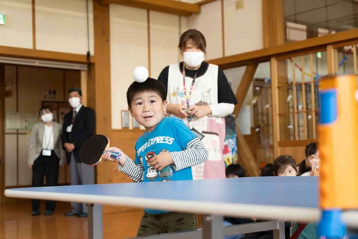 もりやまこども園本園は昨年度に創立50周年を迎え、大川分園は来年度に創立50周年を迎えます。この記念すべきときに、園も子どもたちも笑顔になる機会を与えていただき感謝しています。保護者の方々からも、とても嬉しいという声が聞こえてきます。夏は大雨の被害で町が大変でしたが、子どもたちの笑顔が何よりの復旧の励ましになります。五城目町はもともと卓球が盛んな地域でした。現在も愛好者がたくさんおり、園として、たくさんの人と交流するために活用していきたいと思います。