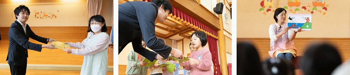 贈呈式で園に絵本が寄贈され、園児一人ひとりにも「ピンピンポンポン」を手渡した