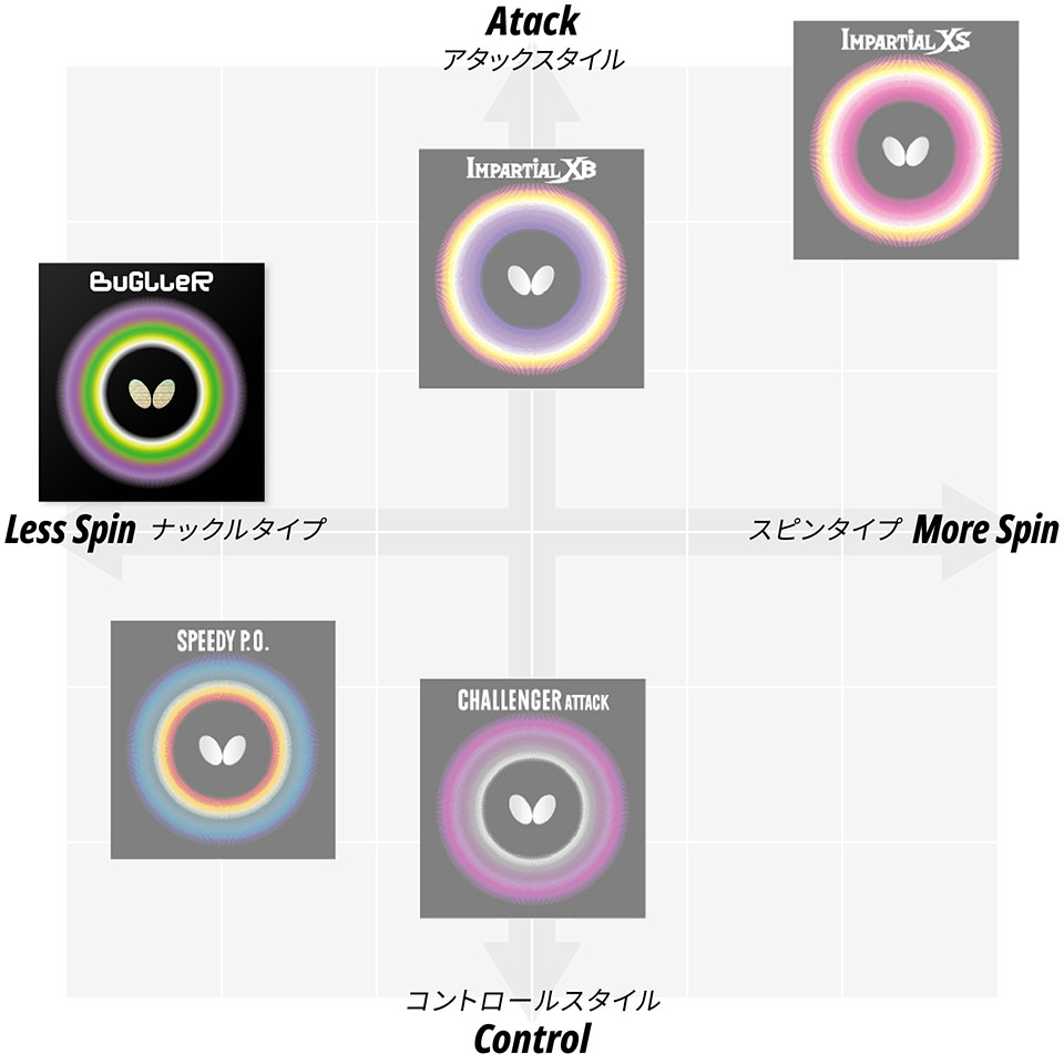 変化の出やすさを追求したツブ形状と「スプリング スポンジX」の組み合わせが対戦相手の嫌がるナックル性ボールを生み出します。「ハイテンション技術」によりスピードボールでも威力を発揮。『バグラー』 から繰り出される予測不能なボールで対戦相手のリズムとラケット角度を