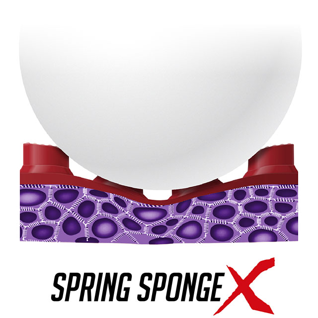 さらなるスピードとスピンを生み出すために、より変形しやすくより弾むスポンジを追求しました。『ディグニクス』シリーズに採用された「スプリング スポンジX」は、『テナジー』シリーズに採用された「スプリング スポンジ」に比べて、ボールが食い込むときの変形しやすさが約14パーセント、はね返るときの反発弾性が約3パーセント向上しています。この差は打球の威力において大きな違いとなって現れます。