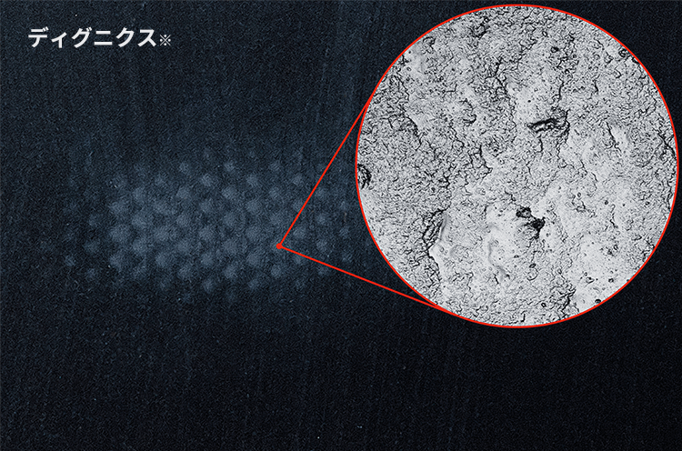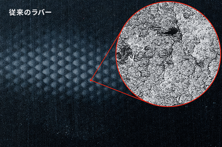 ラバーは打球するたびに表面が摩耗していく。下の画像は打球を同じ箇所に一定回数当てた後の写真(※)であるが、従来のラバーは表面の摩耗が激しいのに対し、『ディグニクス』の表面はそれほど荒れていないことがわかる。このことが『ディグニクス』のシート表面の摩耗耐久性の向上を示している。