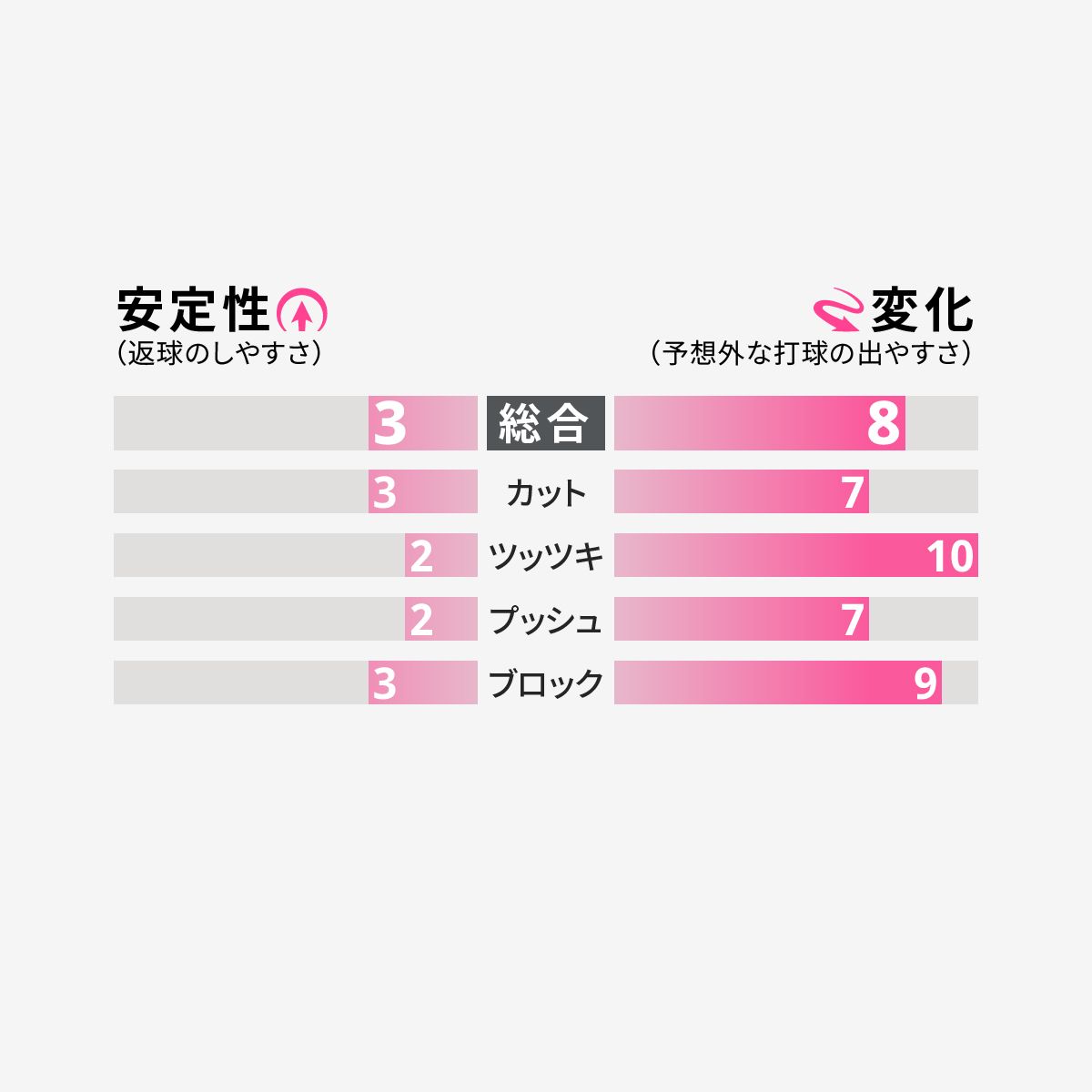 ※測定および評価方法の向上に伴い、2023年2月よりバタフライ・ラバーの性能指標を改定いたしました。詳細はこちら