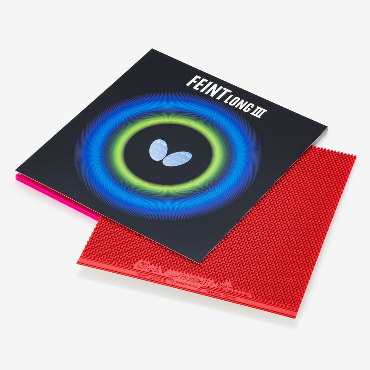 『フェイント ロングIII』はツブの細長さ(アスペクト比)をルールで許される限界に保ったまま、ツブが適度に倒れるように形状や硬度を設計。高い安定性に加えて、打球に回転量の差を求める前陣攻守型や切れ味を求めるカット主戦型にお勧めです。