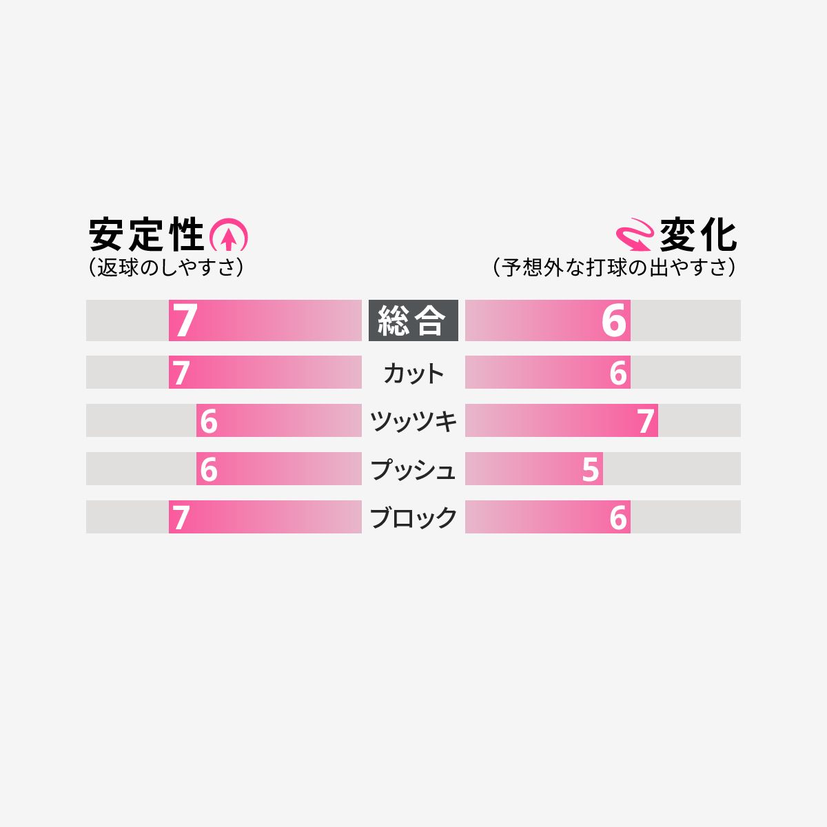 ※測定および評価方法の向上に伴い、2023年2月よりバタフライ・ラバーの性能指標を改定いたしました。詳細はこちら