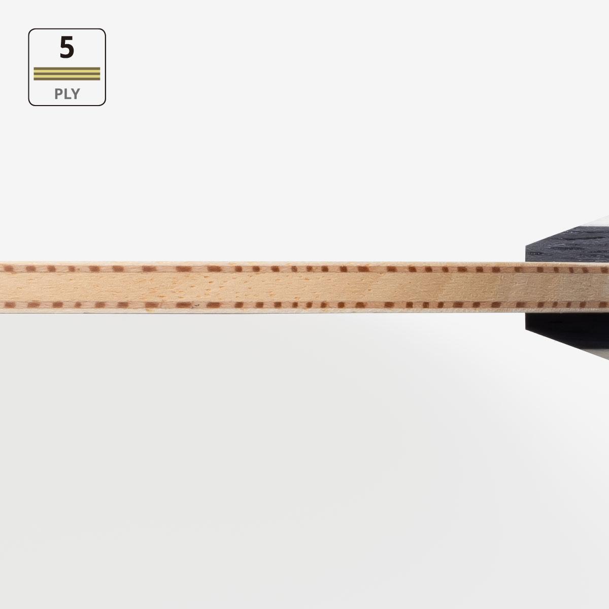 木材5枚合板ラケットの中では薄めの板厚ながら、適度な弾みを実現。純木材ラケットの打球感や回転のかけやすさとともに、打球の威力も求める中級以上の選手にお勧めです。