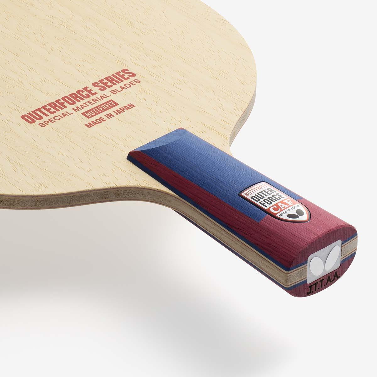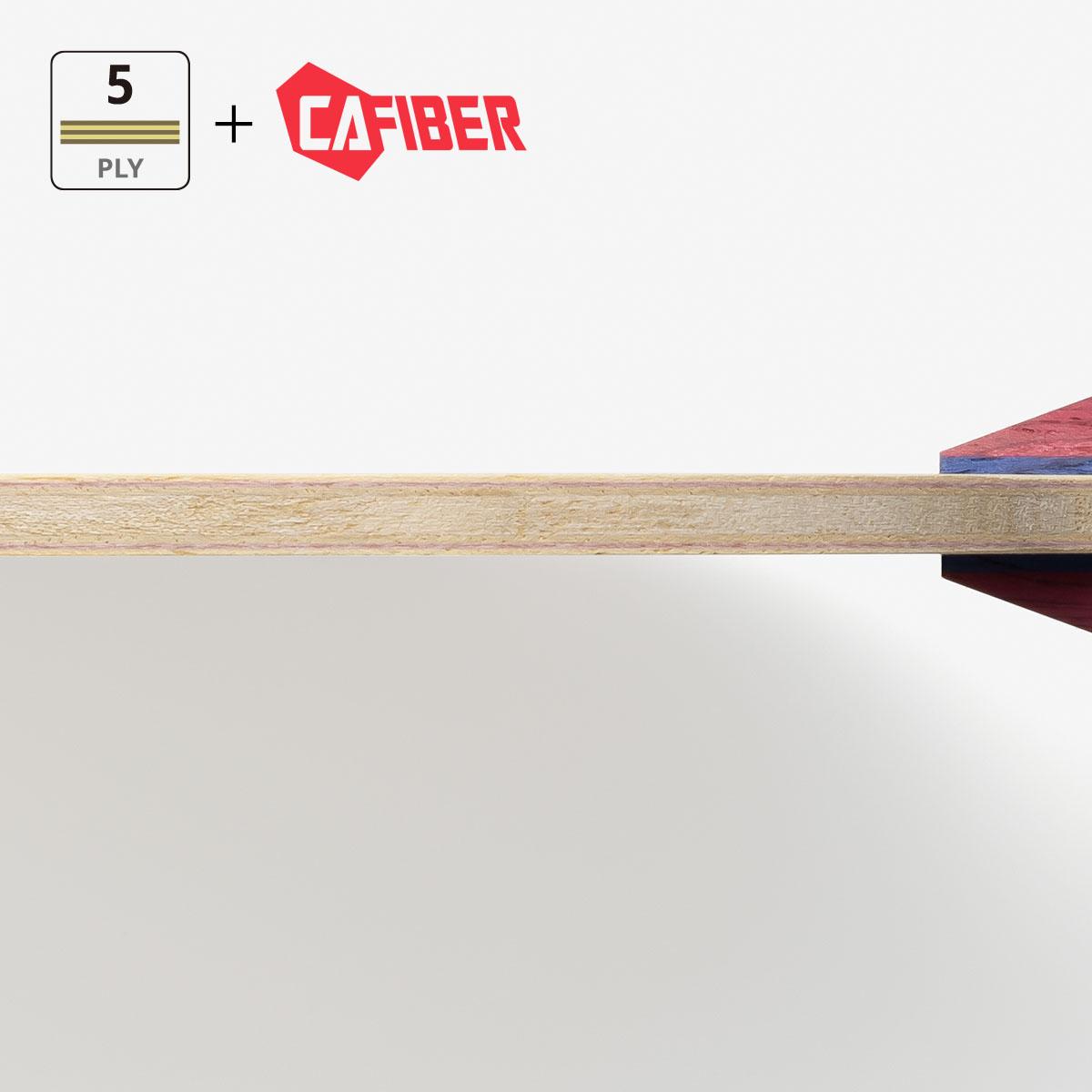 アウターファイバー仕様のラケットの中でも、弾みを抑えめに設計。球離れのよさと安定性が持ち味の、初~中級者向けのラケットです。木材のような打球感を引き出すCAFが、高いコントロール性能を発揮。初めての特殊素材ラケットとしても、卓球を始める1本目のラケットとしてもお勧めです。