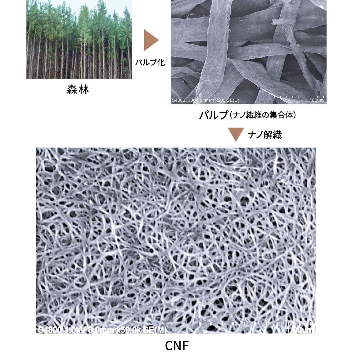 CNFとはセルロースナノファイバーの略称で、木材などの植物繊維をナノサイズ(※)まで細かくほぐすことで得られる極細繊維。「鉄の5分の1の軽さで5倍の強度」と称されるなど、従来の紙パルプとは異なる特異的な性能を持つ。また、植物由来であることから再生可能資源としても注目度が高まっている、革新的で最先端のバイオ素材である。