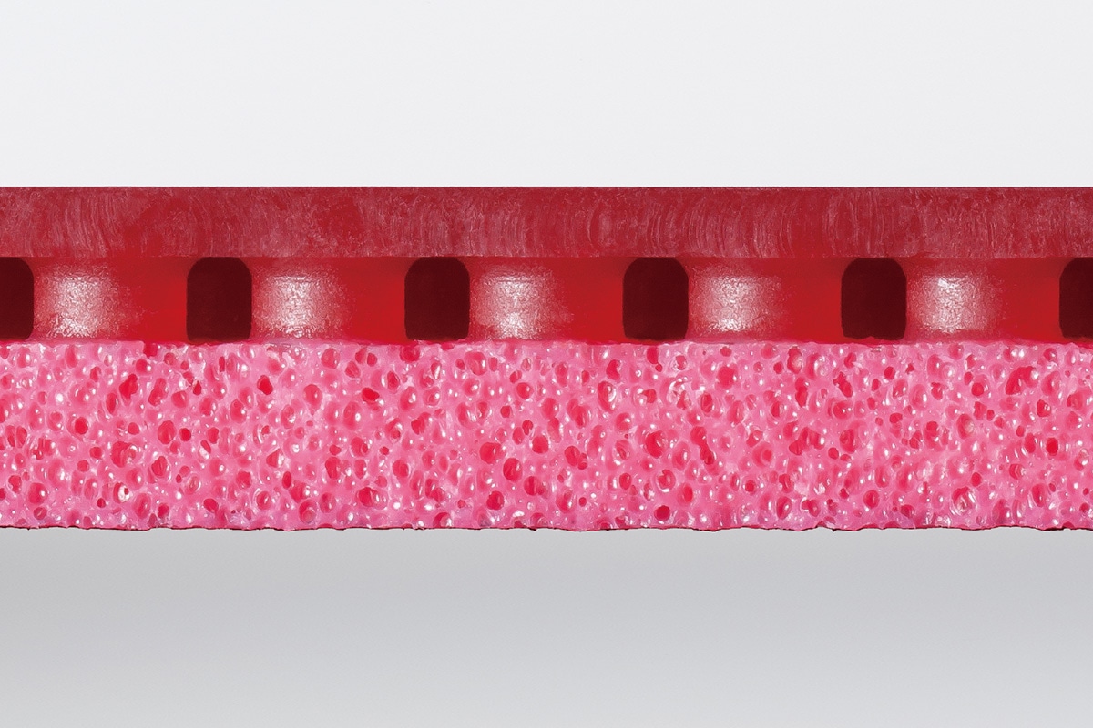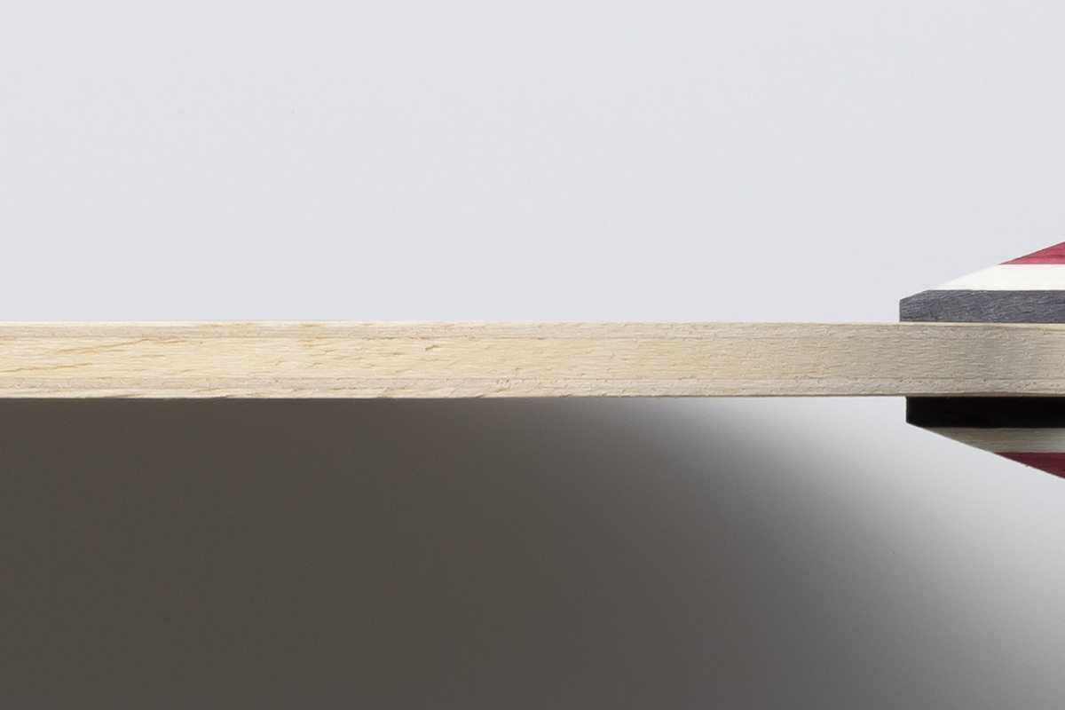 “入門用のラケットとして重視した性能は、「スイング方向にボールが飛ぶ」「ボールが落ちにくい」「卓球台に収まりやすい」というものです。 ネットミスを防ぐにはラケットを起こし、オーバーミスを防ぐにはラケットをかぶせるといったラケット角度の調整が必要です。 しかし、初心者にとって、この二種類のラケット角度の調整は容易ではありません。そこで、ラケットをかぶせる調整のみで済むようにするために、「ボールが落ちにくい」性能を目指しました”