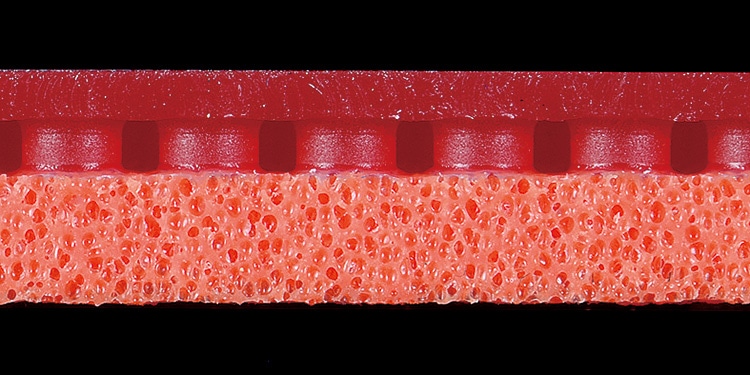 『テナジー05』をサイドから撮影したもの。トップシートは粒の部分がスポンジに接着されており、この粒の高さや太さなどの「粒形状」、そして粒と粒の間隔などがラバーの性能に大きな影響を与える