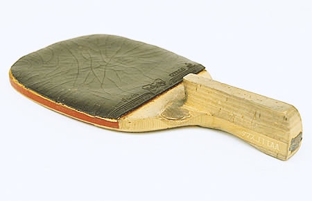 世界卓球選手権ピョンヤン大会で、小野選手が世界チャンピオンに輝いたときに使用したラケット。檜単板のペンホルダーで、重量はラバーを貼った状態で127g。小野はラケットをそれほど深く握るグリップではなかったため、人差し指をかける部分の削りは浅めになっている。