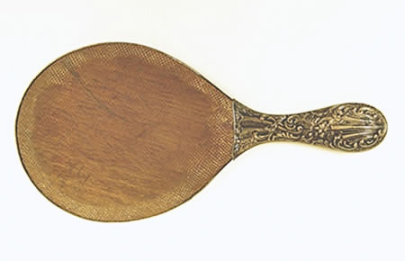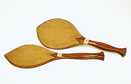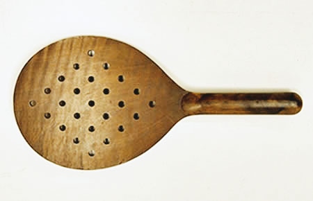 木材で作られたラケットで、打球面に穴を空けたもの。穴の分だけ軽量化が計られ、重量はおよそ100g。表面に皮や紙を貼って使用していたのかは不明。
