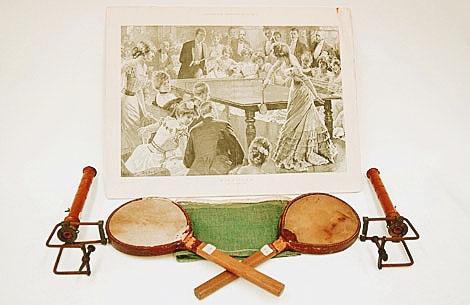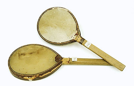 木材で作られたフレームに羊の皮を張り合わせて作られたバンジョーラケットの一種。柄の部分がかなり長めとなっている。写真の2本ラケットは同タイプのものだが、重量は96gと86gと少し差がみられた。