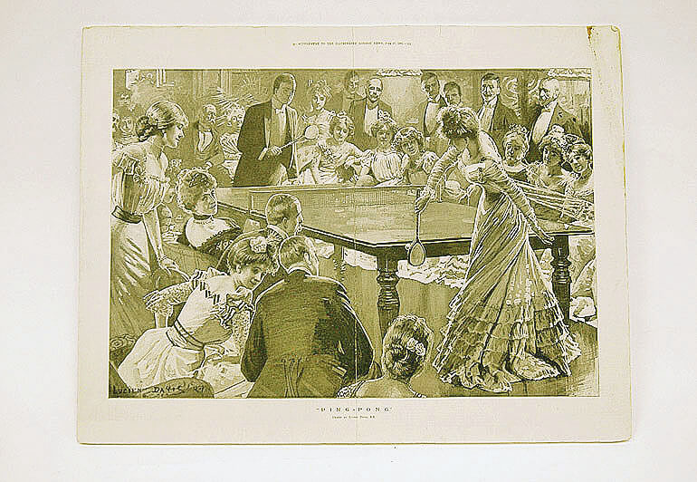 やがて、"ピンポン"が人気になるにつれ、用具も次第に進化し、変化していった。右の絵画は1901年に描かれたものであるが、そこには柄の長いバンジョーラケットを用いてラリーを楽しむ姿が描かれている。また、テーブルの横にサポートが取り付けられて、ネットが張られていることも分かるだろう。