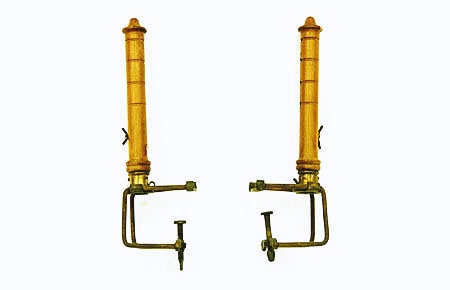 以前に使用されていたネットサポート。台に取り付ける部分は金属で、支柱の部分は木材で作られている。また、支柱にはネットを固定するためのひもを通す穴が開いているなど、工夫がある。