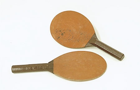 木製のラケット。表面には現在のラバーを思わせる薄いゴムのようなものが張られていて、その表面は表ラバーのように表面に凹凸がある。ラケット自体の重量はおよそ130g。バンジョーラケットと比べると、やや重量感のあるものになっている。