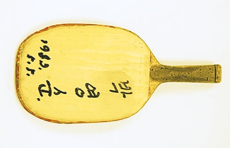 1975年、1977年の世界卓球選手権大会で2連覇したときのラケット。ペンホルダー角型単板ラケットを使用。その重量は、ラバー貼りで150~151g。一般的なものよりやや重めのものとなっていた。ラケットの裏面には、本人直筆のサインとバタフライ史料館に寄贈された年月日が明記されている。