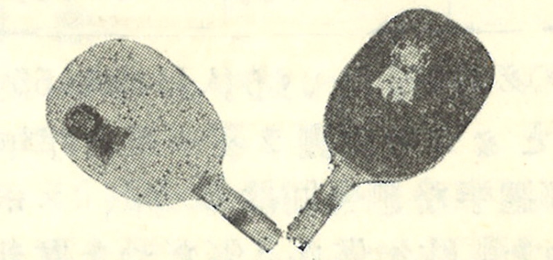 当時、中国の一流選手が愛用していたグリップが短くブレード面が丸型の中国式ラケット(5枚合板)を発売した。写真右は当時発売されていたパッケージ入りの製品。 -