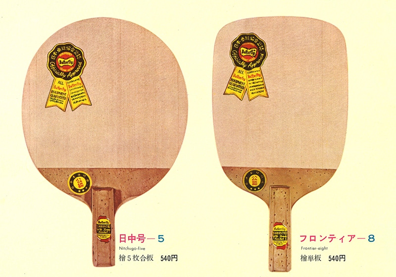 日本式グリップと中国式丸形ブレードの長所を取り入れた日中号-5(ファイブ)を発売。檜5枚合板でグリップは8cmだった。フロンティア-8(エイト)は「角形ラケットで速攻」という新境地を開拓したい選手のために開発した檜単板ラケット。角形の中ではグリップが短め(8cm)で、ブレードの厚みには標準(前陣速攻用)と厚め(強打用)の2種類があった。 -