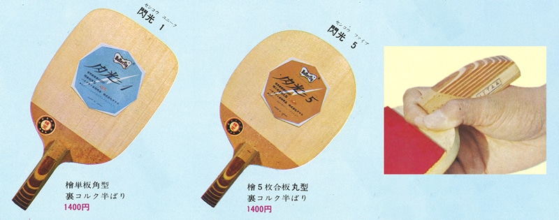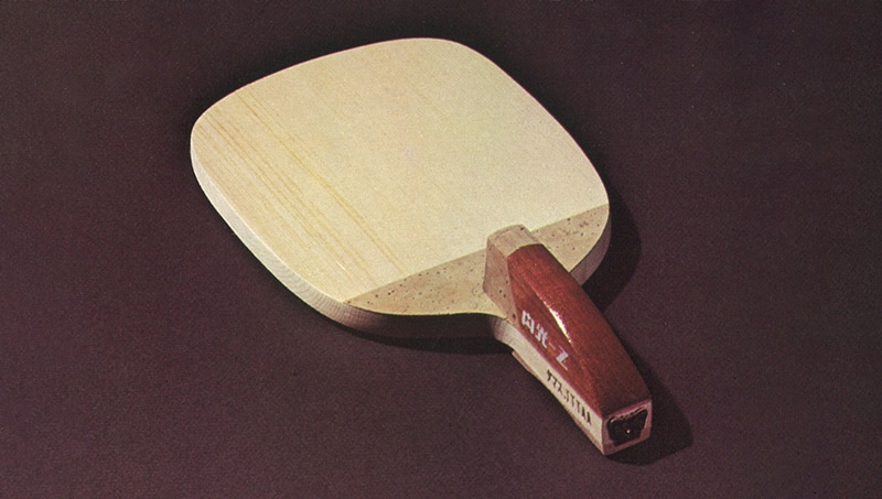 流線型ショートグリップで好評を博す閃光シリーズに、裏面が白木の閃光Z(ゼット)を追加。1975年当時の価格は、裏面が半円コルク&色塗りの閃光-1と閃光5 '74が3,400円、裏面が白木の閃光Zが2,400円だった。 -