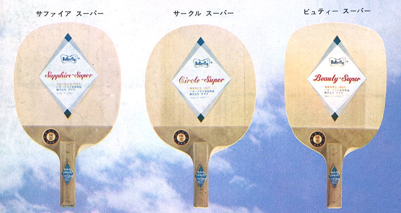スタンダードグリップのスーパーシリーズを発売。サファイア・スーパーは中板に桐材を用いた丸型の3枚合板、サークル・スーパーは丸型の檜単板、ビューティー・スーパーは角型の檜単板だった。 -