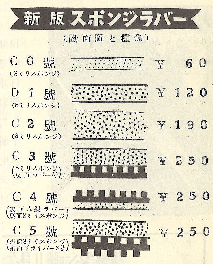 スポンジのみのもの、スポンジにシートを重ねたもの(表ソフト)、シートにスポンジを重ねたものがあった。シリーズのうちC4号に人気があった。 -