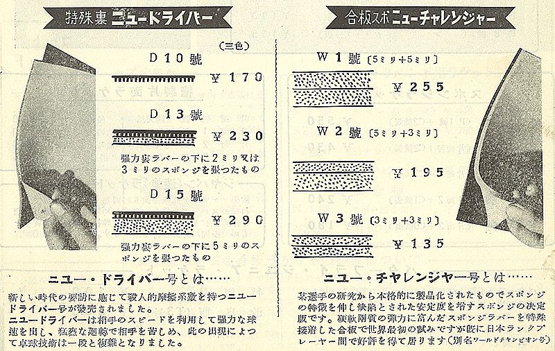 ニュードライバー・シリーズは摩擦係数を高めた裏ラバー。シリーズのうちD13号が後の裏ソフトラバーの原型となった。ニューチャレンジャー・シリーズは2層のスポンジからなるラバーだった。また、この年、オーソドックス・シリーズに小粒のラバーを追加発売した。 -