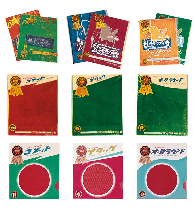 ラバー全体の厚さを4ミリ以内とするルールが1959年に採択され、そのルールに対応したラバーとして、薄いシートに厚いスポンジのコメット、従来のシートに高弾性スポンジを組み合わせたアタックを発売。同時にD13号、C4号をオールラウンドと改称した。写真は上から発売当初のパッケージ、1963年のパッケージ、1971年のパッケージ。 -