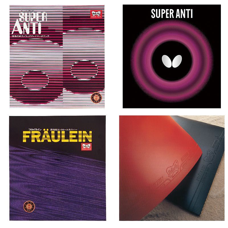 スーパーアンチは打球音を他の裏ソフトラバー(当時)に近づけることで反転プレーに威力を発揮。2020年12月現在もラインアップ。フロイラインは天然ゴム100パーセントの美しい透明度を持ったラバーだった。 -