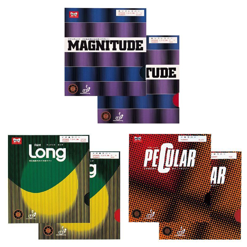 マグニチュードはツブ高ラバーに近い表ソフトラバー。フェイント ロングはフェイント ソフトのツブをさらに高くしたツブ高ラバー。ペキューラは世界最軽量(当時)の一枚ラバー。 -