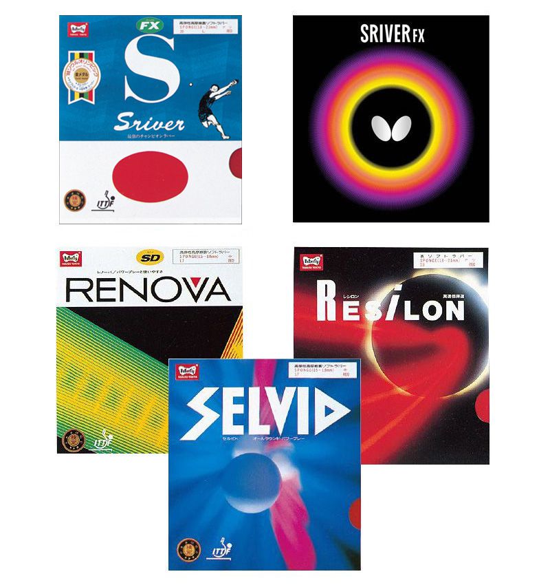 スレイバーFX(フレックス)はスレイバーのスポンジが軟らかいバージョンで2020年12月現在もラインアップ。レノーバSD(スピード)はレノーバにスピードスポンジを組み合わせたもの。セルビドは「オールラウンドパワープレー」のキャッチフレーズで登場した裏ソフトラバー。レシロンは球離れがよくナックルボールを出しやすい表ソフトラバーだった。