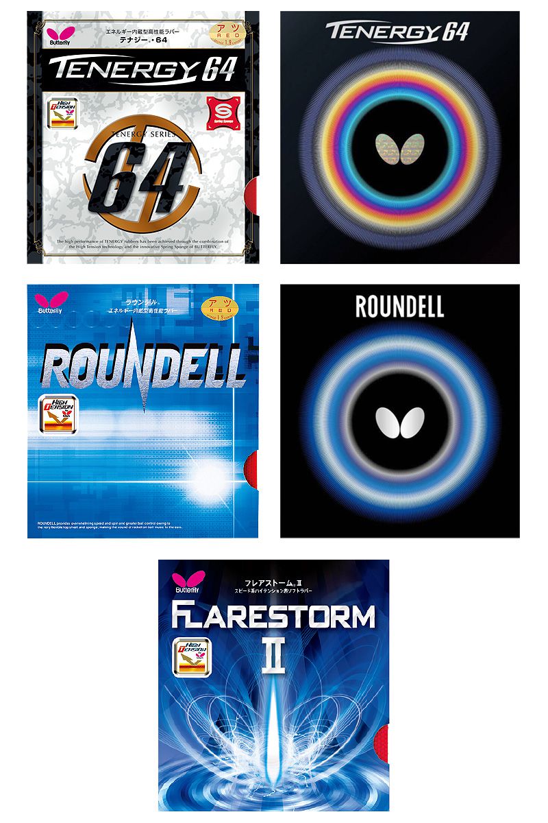 スプリング スポンジを搭載したラバー第3弾のテナジー64はスピード性能が高く、国内外の多くの選手が使用した。2020年12月現在ラインアップ。ラウンデルは初級者から上級者まで使えるバランスのよいハイテンション ラバーで2020年12月現在ラインアップ。フレアストームⅡはフレアストームを上回るスピードと軟らかめのスポンジが特徴だった。 -
