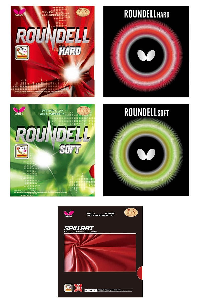 ラウンデルのスポンジが硬いバージョンと軟らかいバージョンを同時発売。2020年12月現在もラインアップ。スピンアートはスプリング スポンジを搭載した粘着性ラバーだった。 -