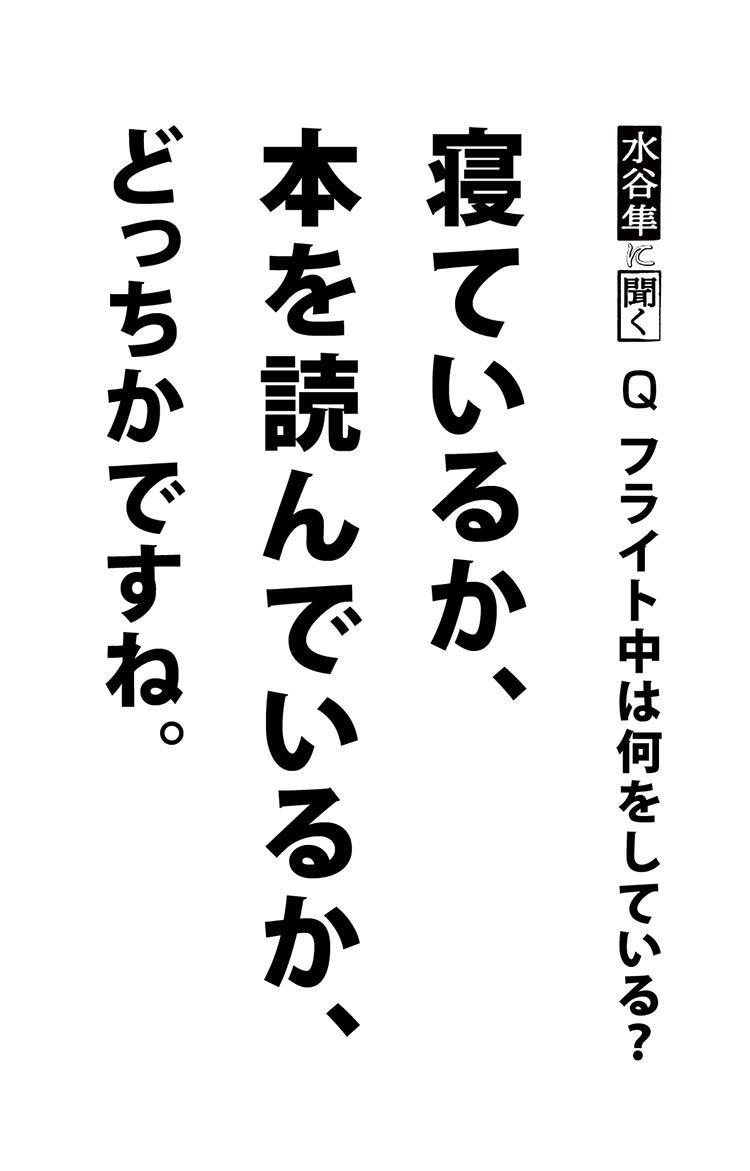少年時代から世界中を飛び回って活躍している水谷隼選手。その水谷選手が、飛行機での移動中に読む本のジャンルは多岐にわたるという。「いろいろです。小説を読んだりとか、それこそ、体のトレーニングの本を読んだりとか」と水谷選手。これまで何となくだが、水谷選手はフィクションはあまり好まないのではないかというイメージを持っていたので、小説を読むことは少し意外だった。